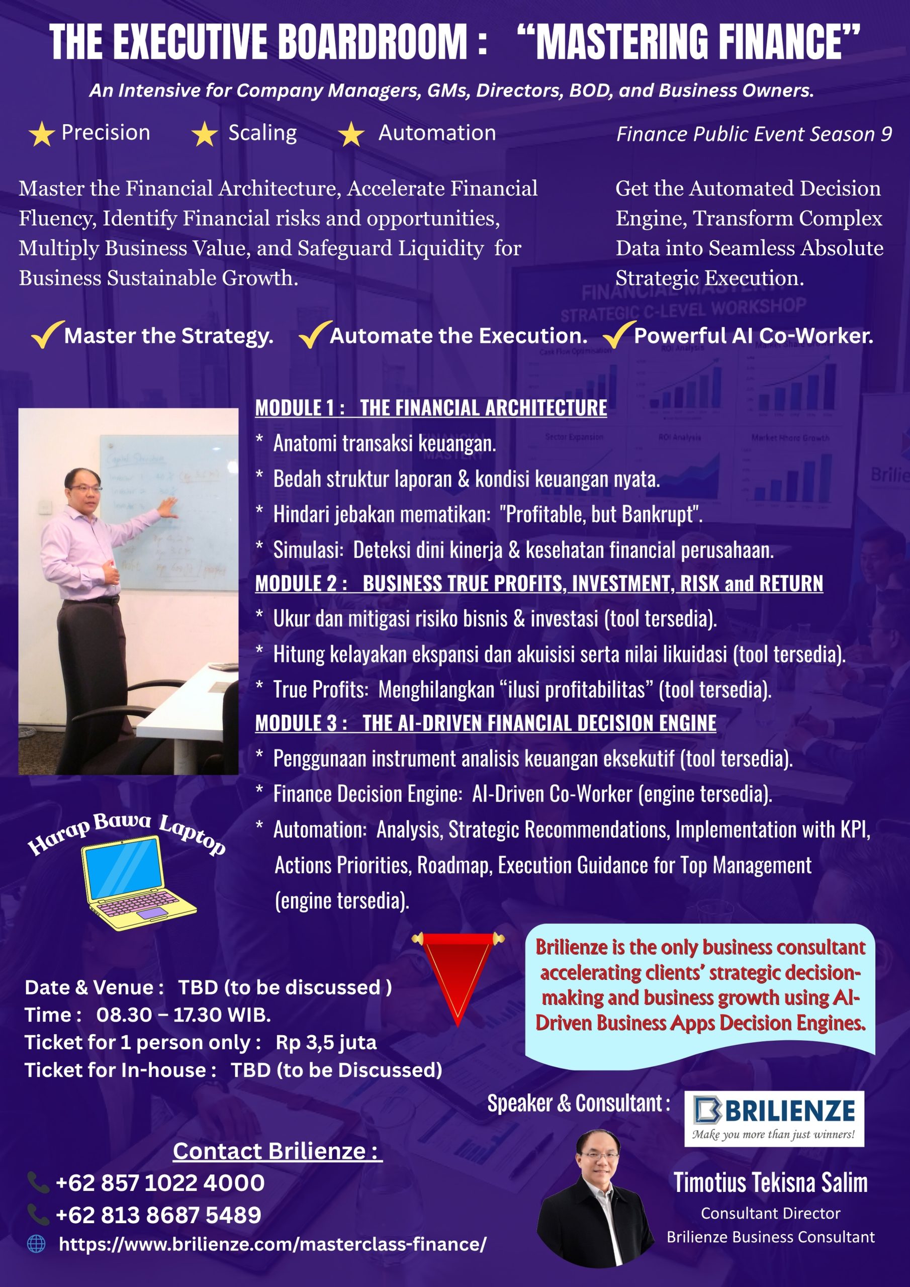 Masterclass ini membantu Anda menguasai mulai dari Financial Architecture untuk mendeteksi kesehatan nyata bisnis, menghilangkan “ilusi profit”, mitigasi resiko hingga mengotomasi keputusan strategis keuangan menggunakan AI-Driven Financial Engine.