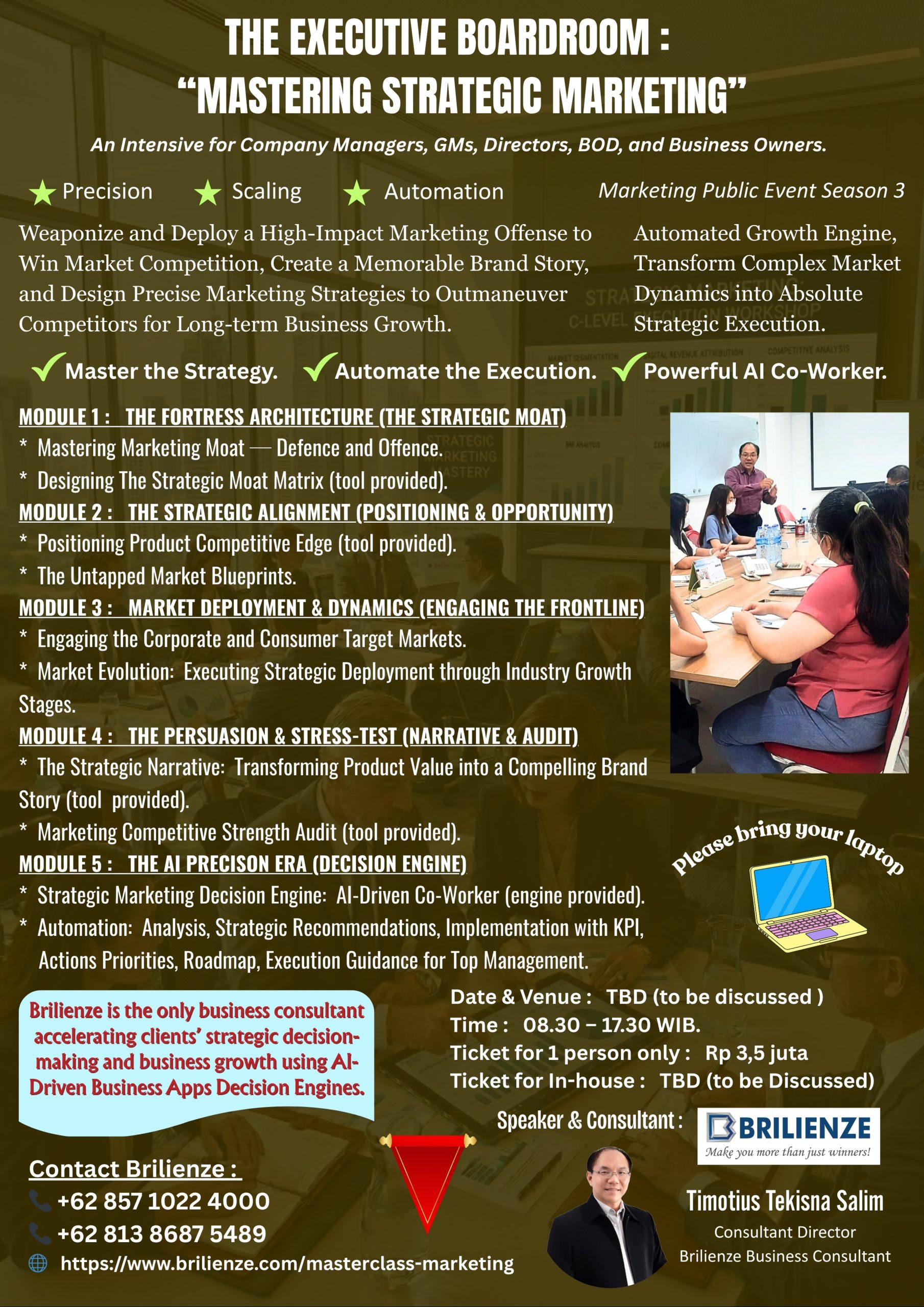 Masterclass ini membantu Anda mulai dari membangun Strategic Moat (benteng pertahanan bisnis), mengunci keunggulan kompetitif di market, menyusun narasi brand yang memikat, hingga memanfaatkan AI-Driven Strategic Engine untuk mengotomasi keputusan pemasaran strategis yang presisi.